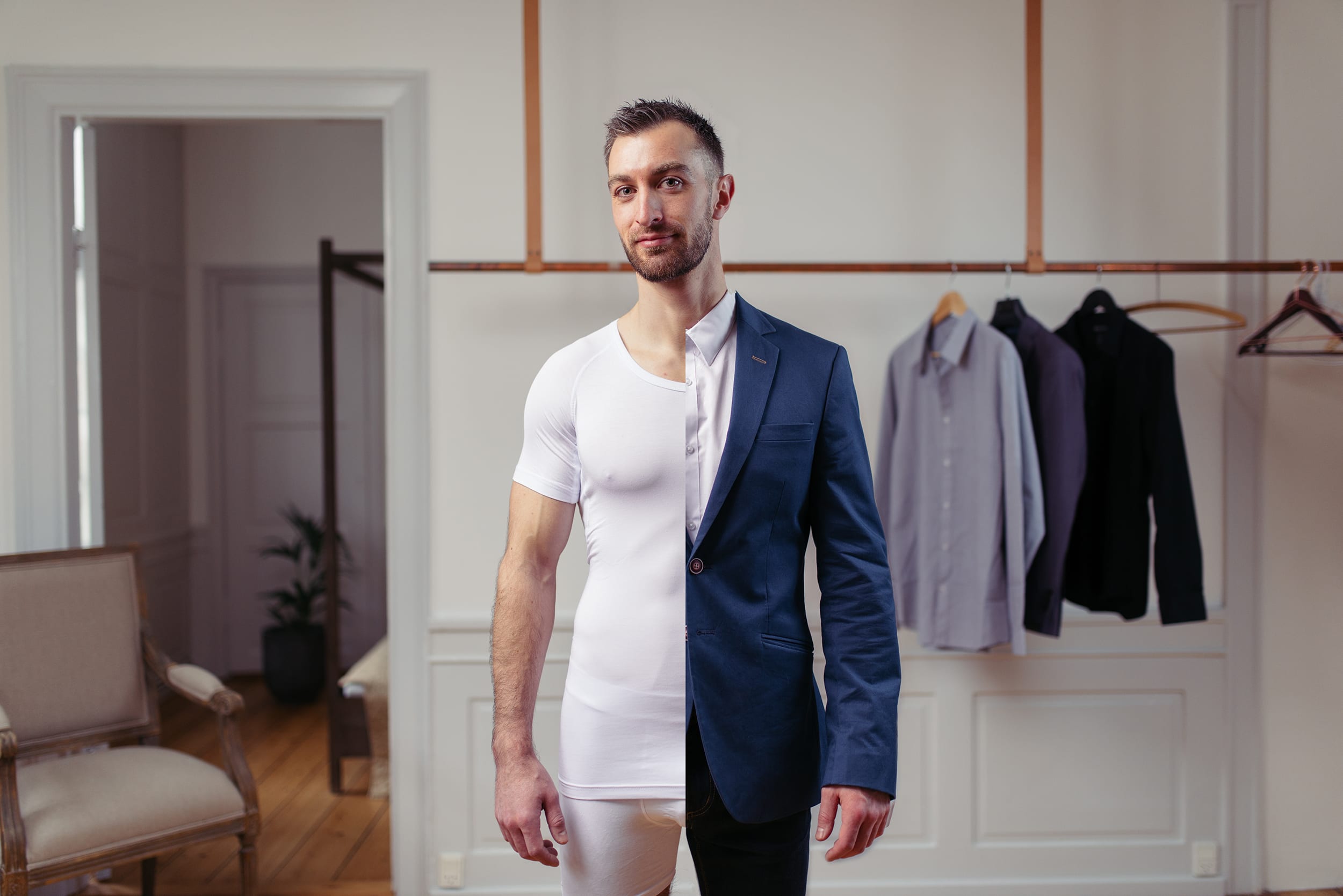 A refined photo campaign for Drywear—practical underwear framed in a premium context